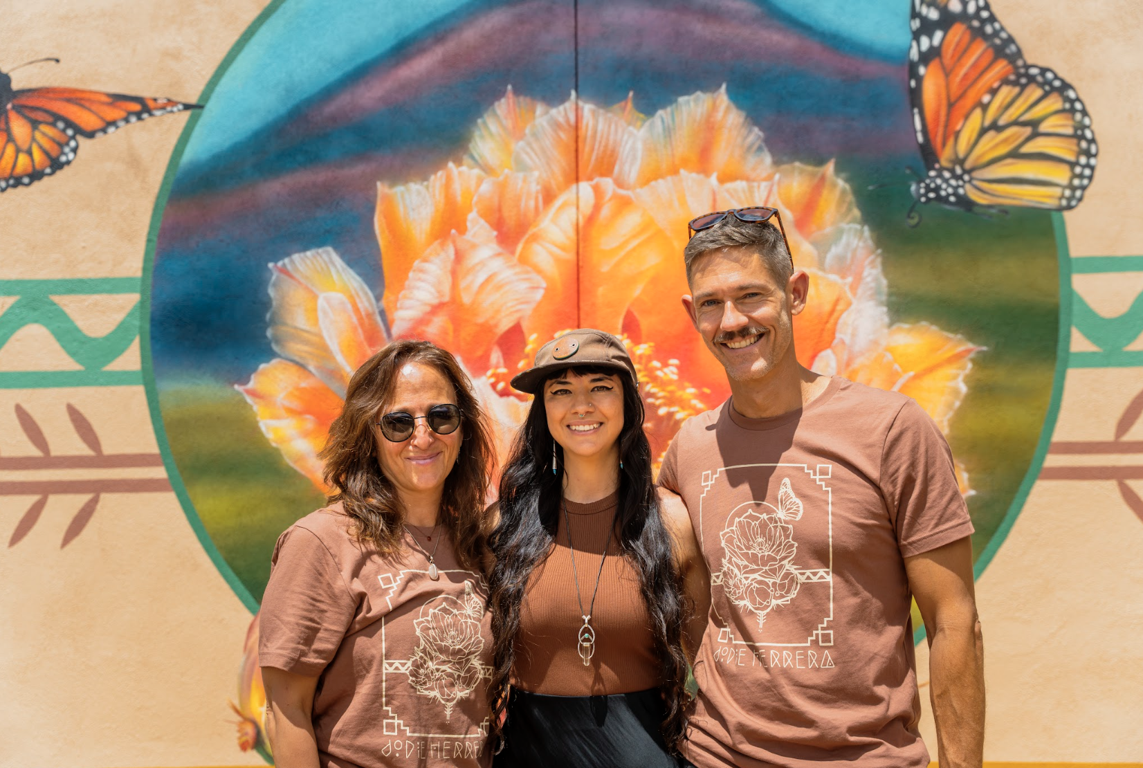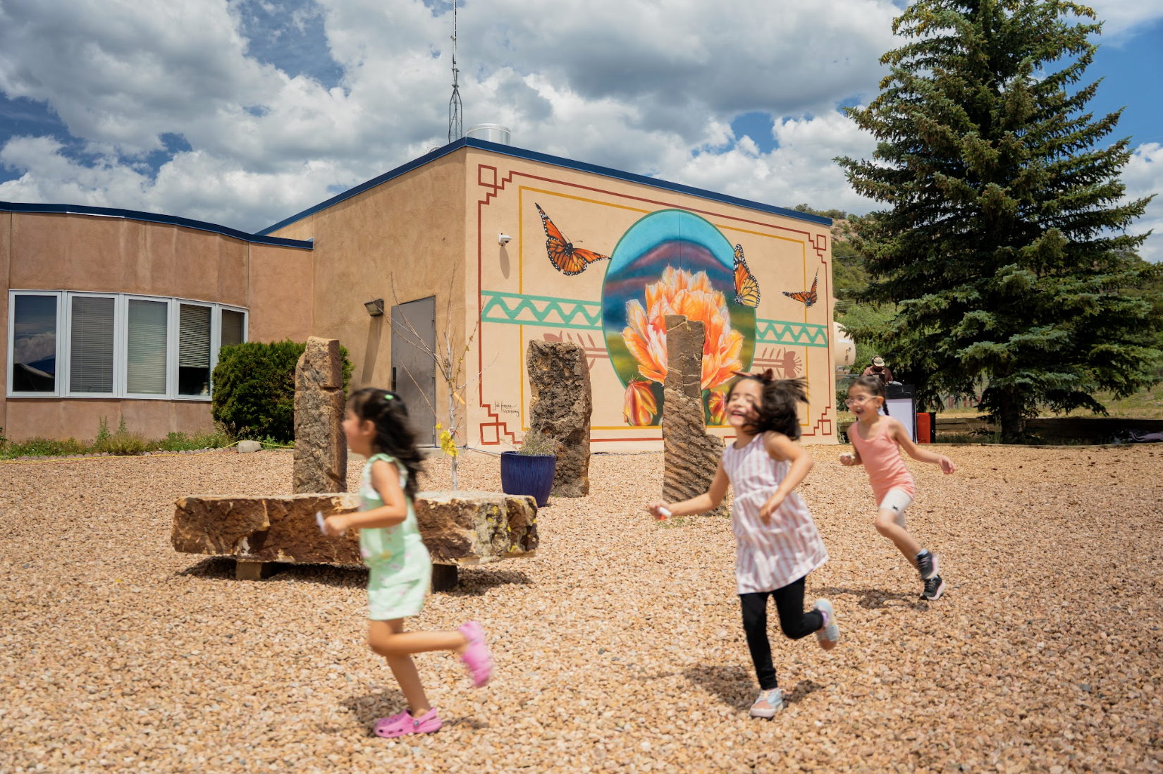 This mural, created for the Penasco Independent School district, in collaboration with 100% Taos, and The Paseo Project, depicts the image of the Jicarita Mountain set behind a Cholla cactus blossom, which is local to the area. The cactus blossom represents the beauty and resilience of the Peñasco community. The turquoise linear design running through the mural honors the rich acequia culture and history. For the youth of the school, as well as the community of Peñasco, the butterflies represent transformation into one’s highest potential.