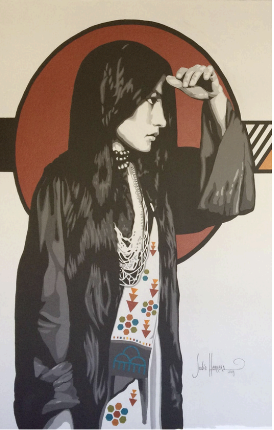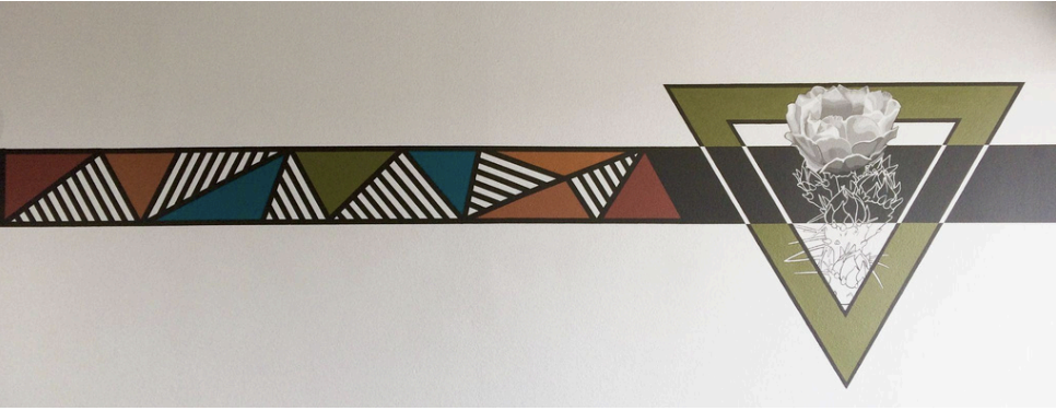 This piece was created for Nativo Lodge hotel and is a themed room created in honor of the sacred feminine. The ancient symbols of the moon, triangle and circle are present to welcome the mother spirit. As grandmothers, mothers, daughters, and sisters, it is our time to navigate. There will be many directions, but if we guide with love, all directions will lead to the betterment of our collective future. This is represented by the arrows and posture of Zitkála-Šá. Her hand is up over her eyes to assist her in looking towards the light that lays ahead. We have embodied the spirit of the desert flower, represented by the prickly pear cacti in full bloom. We have blossomed despite the odds against us. We are strong, resilient, powerful and ready to rise! Zitkála-Šá was a Sioux (Yankton Dakota) woman who lived from 1876-1938 and a suffragist, writer/artist, political activist. She made it her life to fight for civil rights, better access to health care, and education for Native Americans. As an artist, she created the first Native American opera in history and authored many books that intended not only to educate white America of different Native peoples’ culture, but also to illustrate the hardship of cultural assimilation.