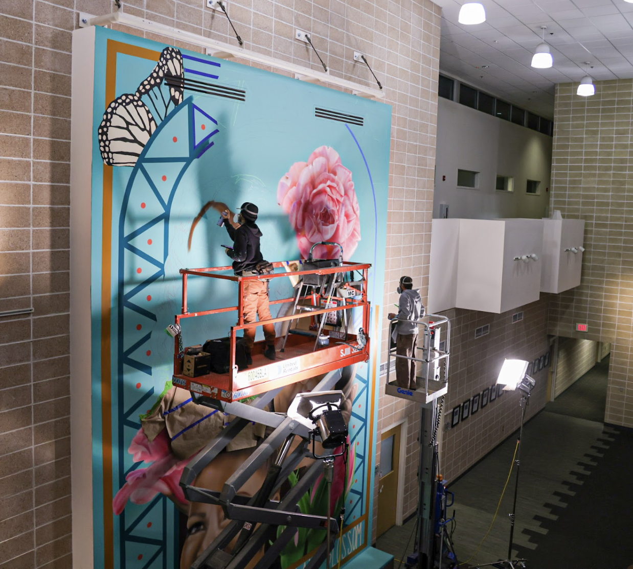 This mural, completed for the WESST Enterprise Center in Albuquerque, celebrates three successful past participants of the program. There is a bud, a blooming flower, and a fully blossomed flower to symbolize growth and the beauty within positive development. The wings symbolize transformation and momentum. The triangles framing the faces represent duality and dots within them represent the tenacity of the individual spirit to preserve. Its title is included to announce that WESST is, “a place for us to grow and blossom”.