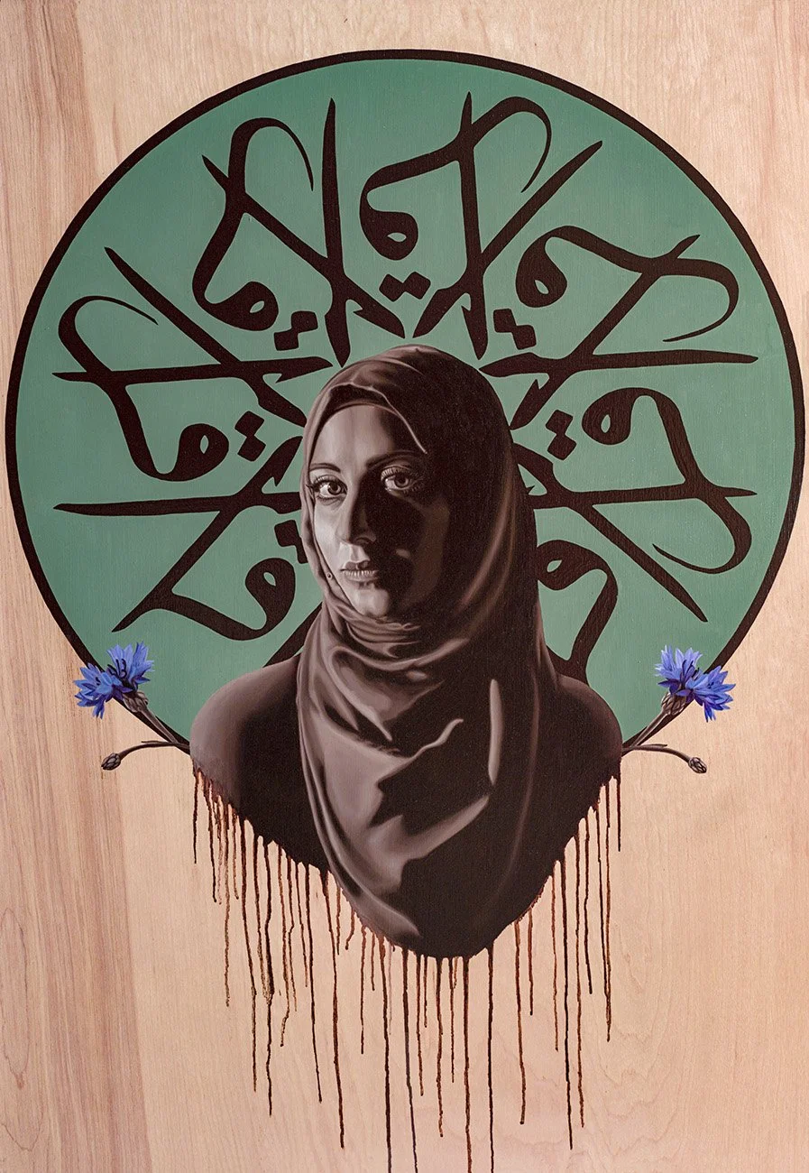 This painting narrates the story of Aya. I had the pleasure of connecting with her while traveling to Berlin, Germany for my project Women Across Borders. Aya has been a refugee in two countries. She is originally from Palestine and took refuge in Syria and later became an asylum seeker in Berlin, so for a large part of her life, she was misplaced and running from violence. The drips that fall from Aya’s hijab symbolize the tears and effort it took to get to where she is today.