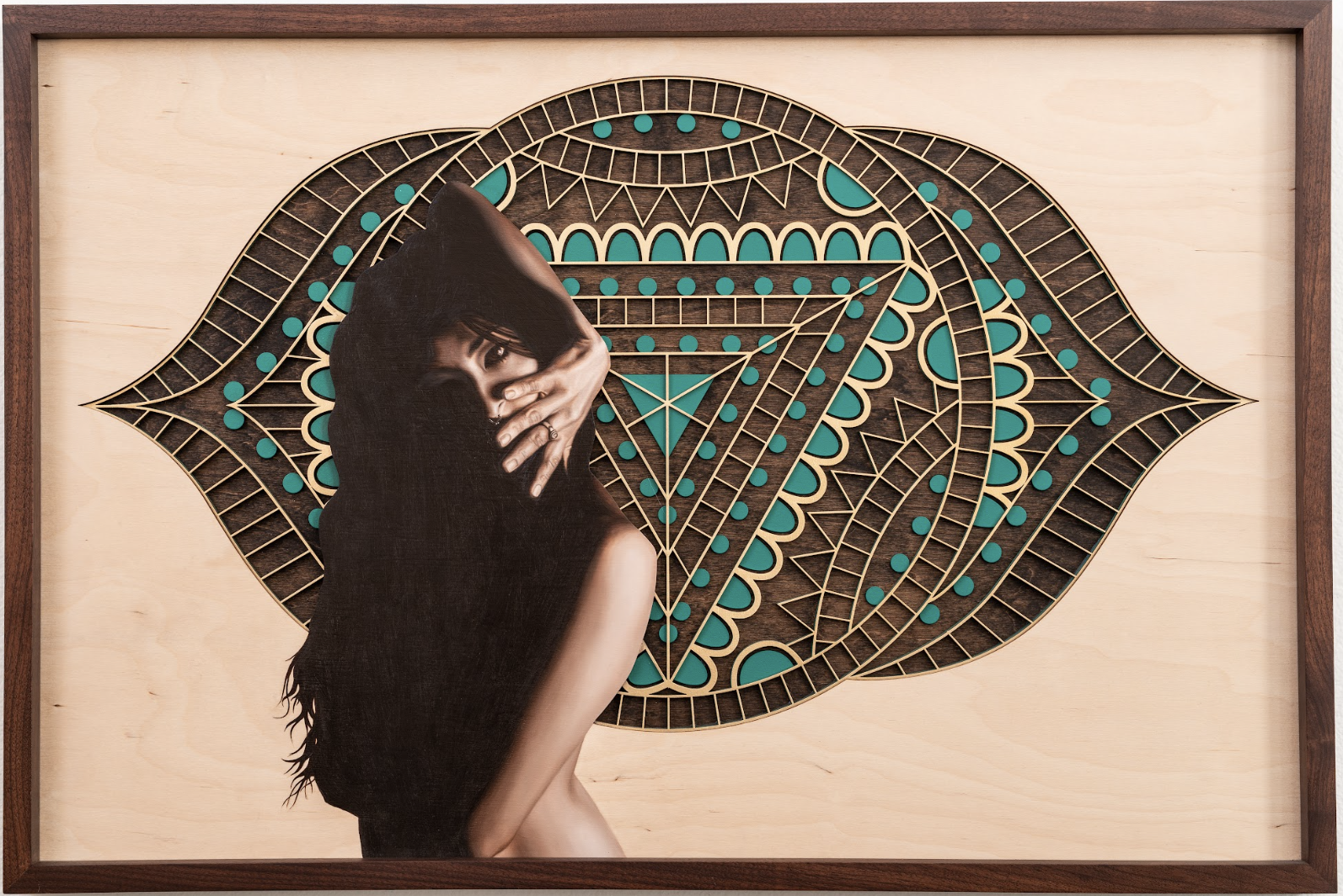 “With her body hidden in the shadows and her arms protectively wrapping herself, Celestina shows us that she has a mysterious and enigmatic depth that only few would be privileged to see. One of Celestina’s challenges in life has been to communicate the richness of this hidden and most vulnerable aspect of herself, even to those closest to her. When she was a child her parents had volatile fights and she observed the chaos that would ensue if one showed their emotions. Because of this she felt that in difficult situations it would be better to hide her feelings from the world and never felt like she had a constructive way to share the most fragile parts of herself. Now she experiences her inner world as something that cannot adequately be expressed with regular human language and signs, as it is a world too weird, too rich, and too emotionally complicated to be reduced to words invented by other people. This is symbolized by the way her hand wraps across her face and shields her mouth, letting the viewer know that they will not know her through her words alone. But other parts of the painting tell us that there may be another way to know her.